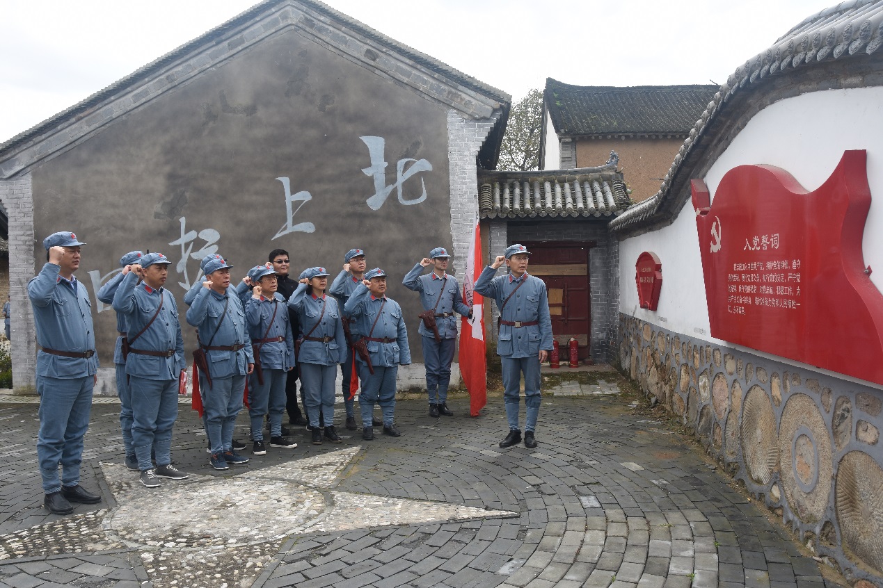 全体党员在党旗下进行重走长征路宣誓仪式,齐声高唱《没有共产党就没有新中国》。
