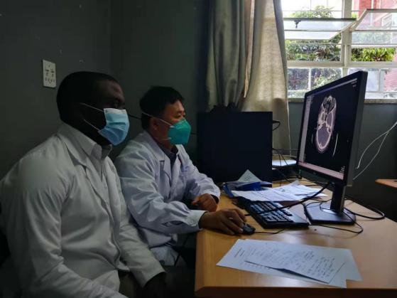 Dr. Qing Yu works at Livingston Central Hospital. Livingston, a beautiful but remote city, is located in the southernmost part of Zambia. This city is as shabby as the town in China in the 1980s and 1990s. The working conditions here are very difficult and life is very inconvenient. But, Dr. Yu Qing has overcome all difficulties. Although the hospital has a CT machine, the Department of Imaging does not have a physician, only a technician, so the hospital attaches great importance to and relies on Dr. Qing. The only CT machine in the hospital has been broken for a long time. When we arrived at the hospital, the machine had just been repaired, so there are a lot of patients. Dr. Yu Qing often works overtime to help the department explain, analyze and teach them how to read the film and write a diagnosis report. He is very busy, and often does not take lunch until 2pm or 3pm in the afternoon. Sometimes when he returned to the dormitory for lunch after getting off work, he was asked by the director of the Department of Imaging to go back to the department for overtime consultation. Dr. Yu Qing received the absolute trust and praise of the director of the department. Picture 2 shows that Dr. Yu Qing and the Director of the Department of Otolaryngology at Livingston Central Hospital diagnose difficult cases together, clarify the scope of lesion invasions, and provide guidance for the next surgery. He was highly praised by colleagues in relevant departments of the hospital.